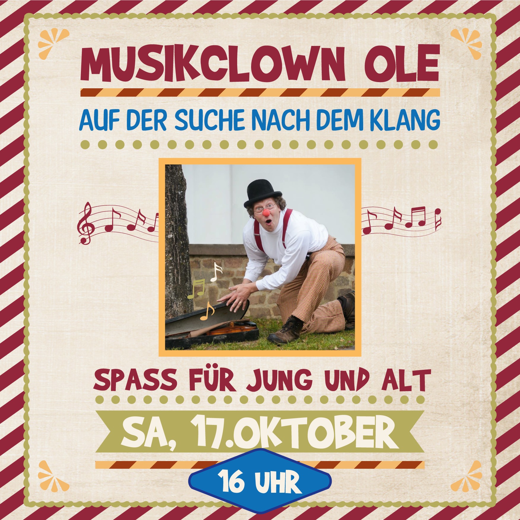 Musikclown Ole kommt mit seiner Wanderbühne nach Mertesdorf. Auf der Suche nach dem Klang sorgt er für Spaß für Jung und Alt. Kommt auf den Parkplatz hinter dem Bürgerhaus und lasst euch überraschen.