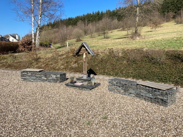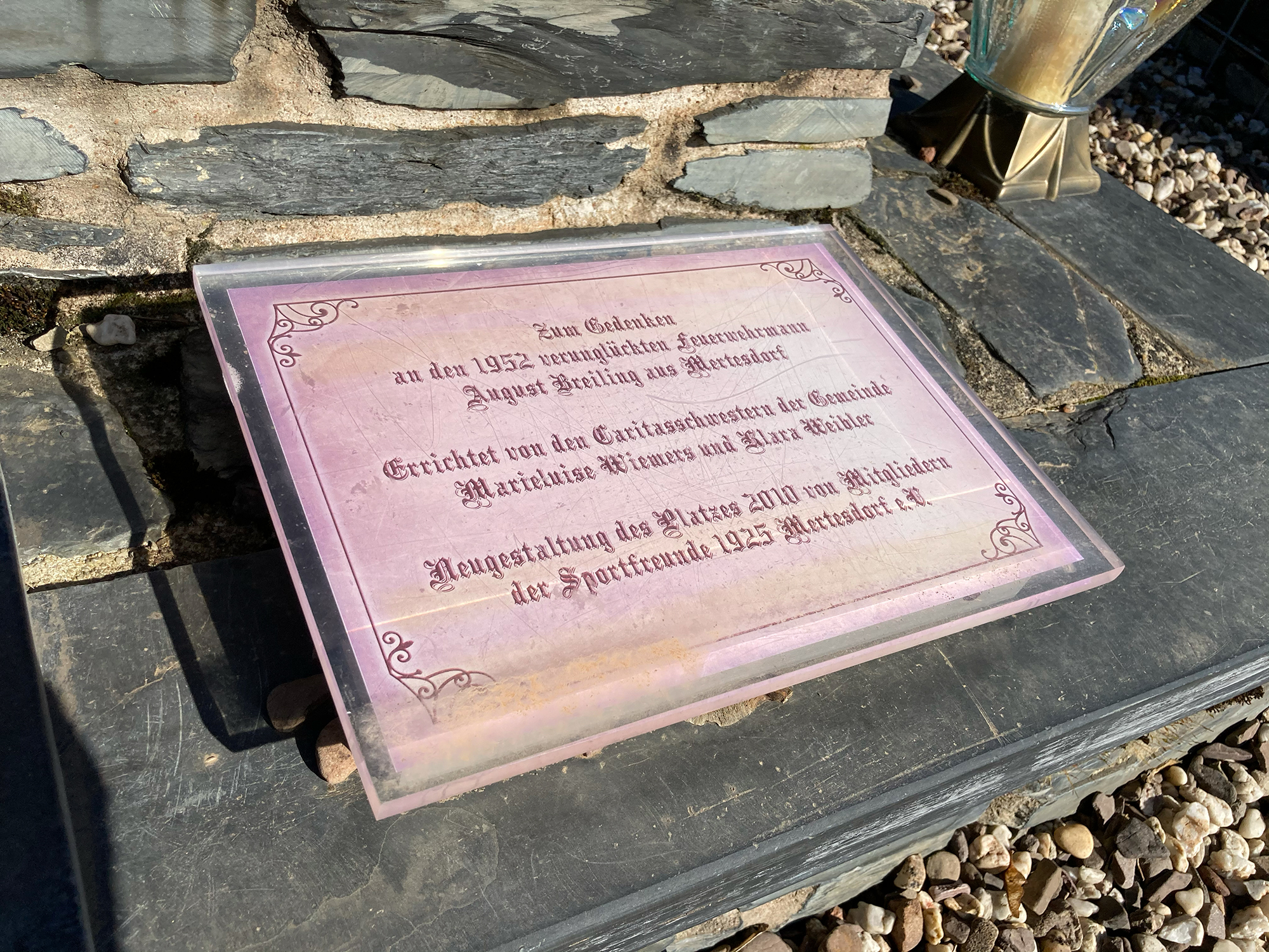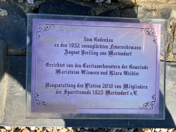 Zum Gedenken an den 1952 verunglückten Feuerwehrmann August Breiling aus Mertesdorf. Errichtet von den Caritasschwestern der Gemeinde Marieluise Wiemers und Klara Weibler. Neugestaltung des Platzes 2010 von Mitgliedern der Sportfreunde 1925 Mertesdorf e.V.